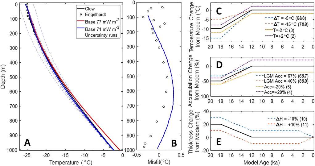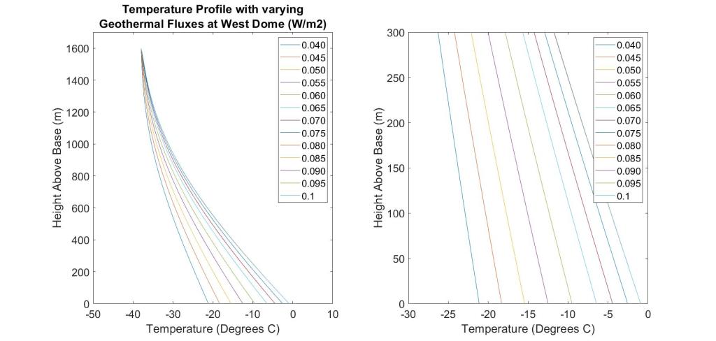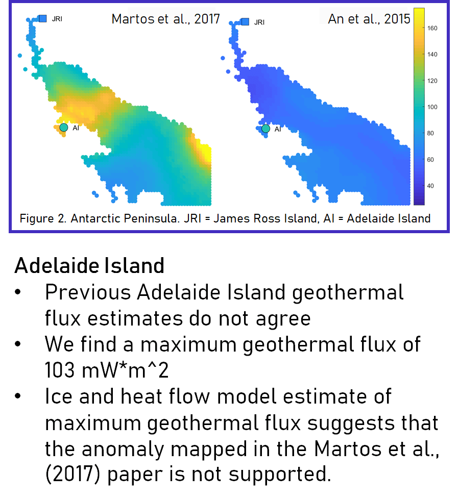 Project Description: Geothermal flux is an important input parameter for modeling the Antarctic Ice Sheet and estimating future sea level changes. High geothermal flux results in basalt melt of an ice sheet, which increases water flow and allows sliding. Direct measurements of geothermal flux in Antarctica are rare, as the ice-bedrock interface is buried under hundreds to thousands of meters of ice. Raymond arches indicate a coastal dome is frozen at the bed and is a site that can be used to calculate maximum geothermal flux. The maximum geothermal flux is estimated by inputting site-specific data of ice thickness, accumulation rate and surface temperature into an ice-and-heat flow model for coastal domes. When a basal temperature is also available, the geothermal flux can be calculated. Sixteen coastal domes were modeled in this project. Geothermal flux was calculated for four sites and maximum geothermal flux was calculated for twelve sites. These results are compared against two continent-wide models of geothermal flux, based off Curie depths and seismic wave refraction. On Adelaide Island, the continental models do not agree, and this site-specific model returns a value in between their geothermal flux estimates, which suggests that the greater geothermal flux estimate is too high. In Dronning Maude Land, the site-specific maximum geothermal flux values are regionally consistent and indicate what site characteristics produce significant results. Sites with greater ice thicknesses, lower accumulation rates, and warmer surface temperatures yield lower maximum geothermal flux estimates, which are more useful in constraining the geothermal flux.